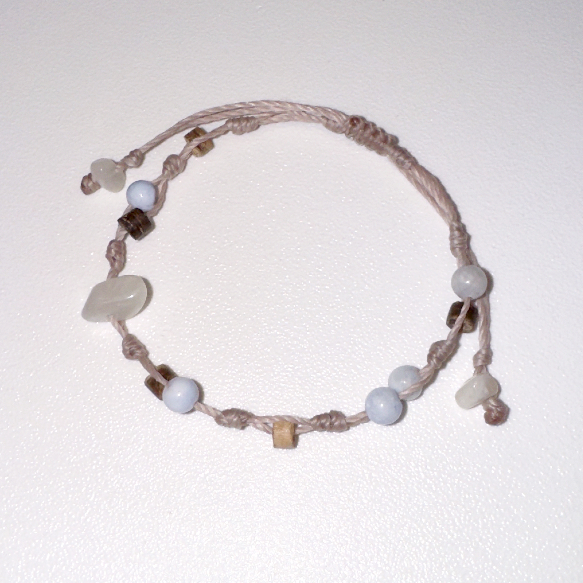 연한 블루 컬러의 칼세도니 원석들과 우드의 색상 조합이 예뻐요.