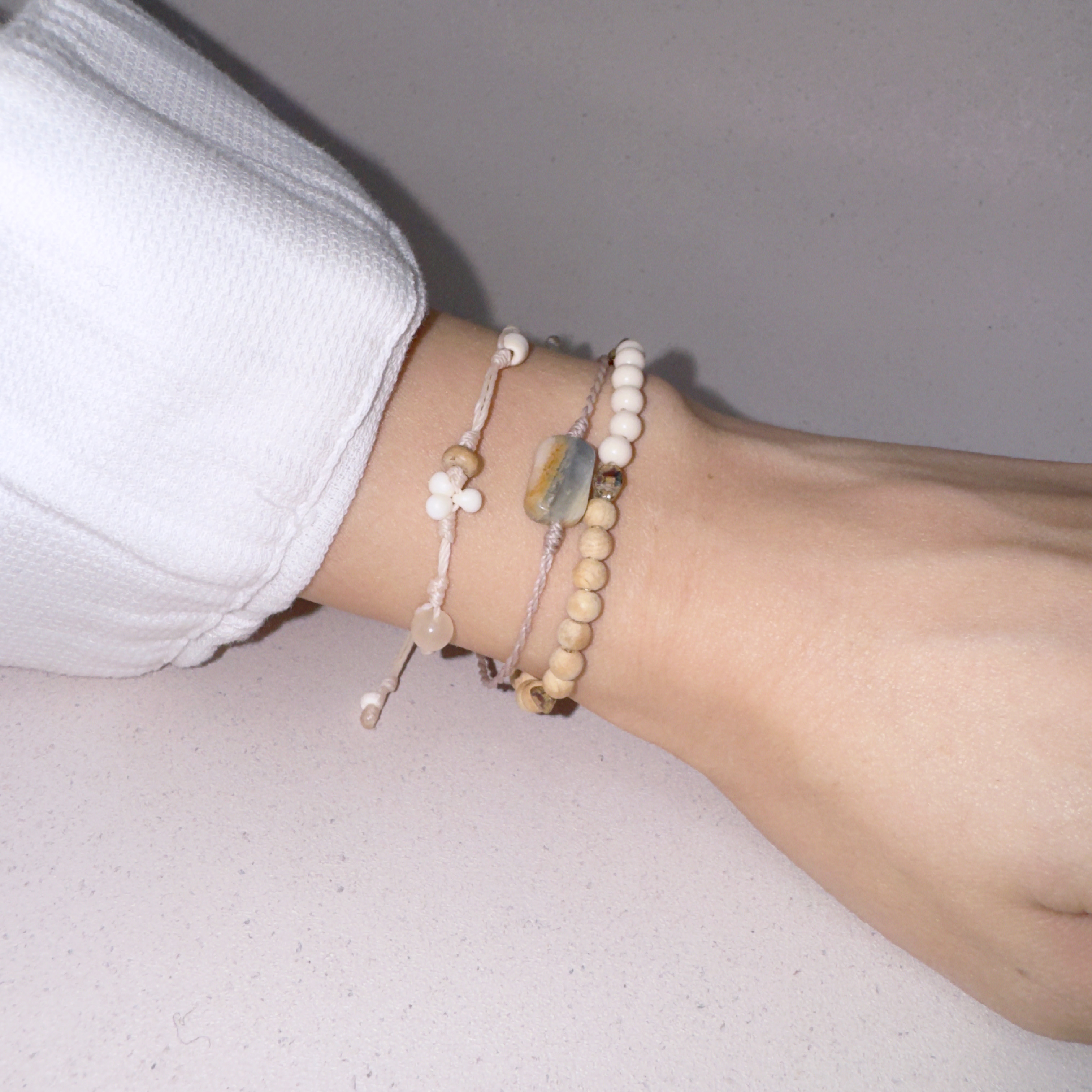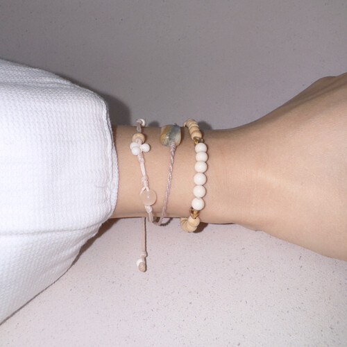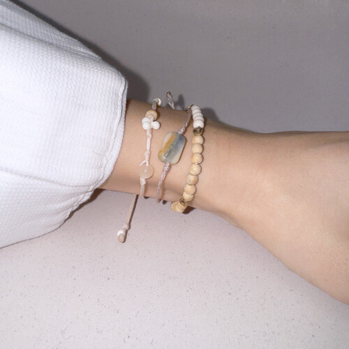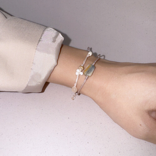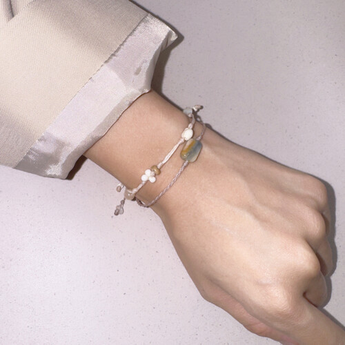 드롭캣츠아이 매듭팔찌(ivory), 따뜻한 나무구슬 팔찌(brown)와 매치한 모습입니다.