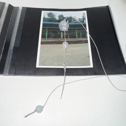 수줍은 흰 꽃에 맺힌 이슬방울을 표현한 끈갈피입니다.