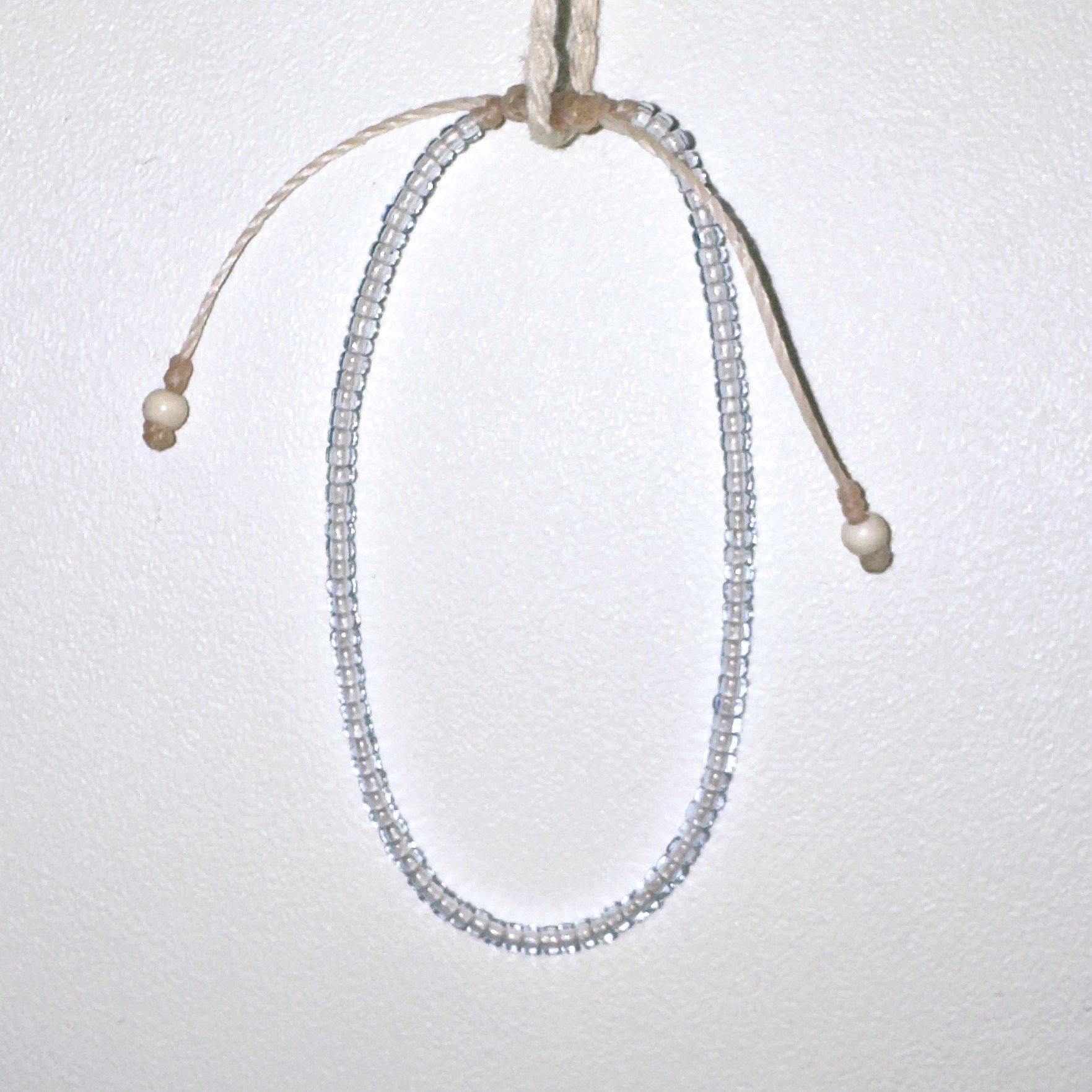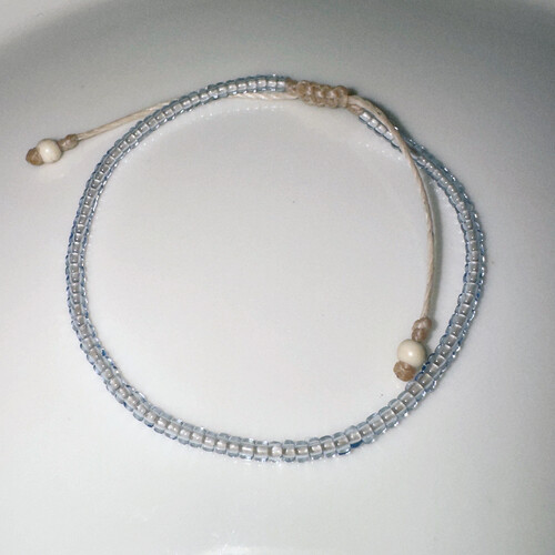 옅은 하늘색의 투명 비즈가 모인 매듭팔찌입니다.