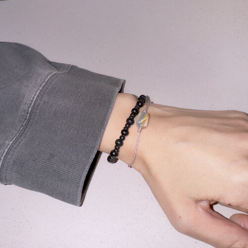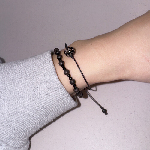블랙 새틴 매듭팔찌, 쁘띠누아 팔찌와 함께한 모습입니다.
