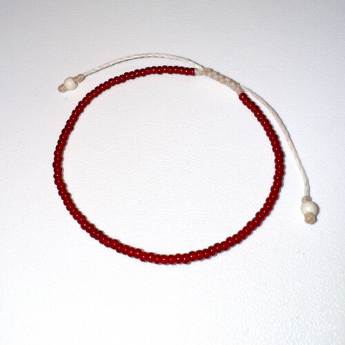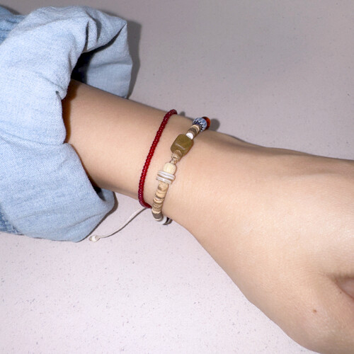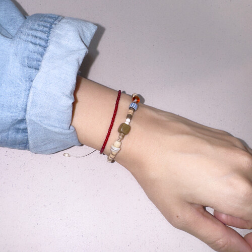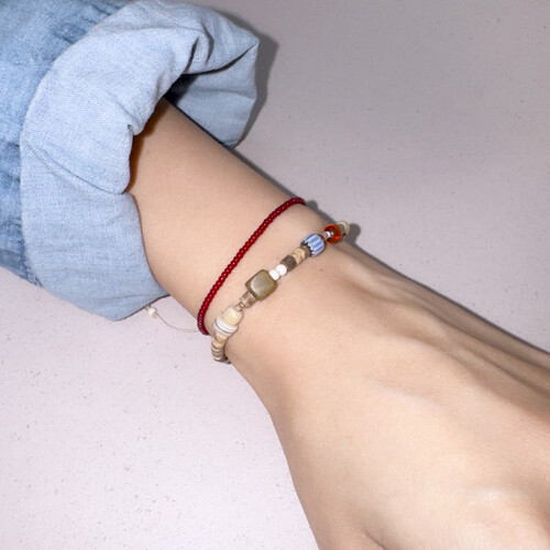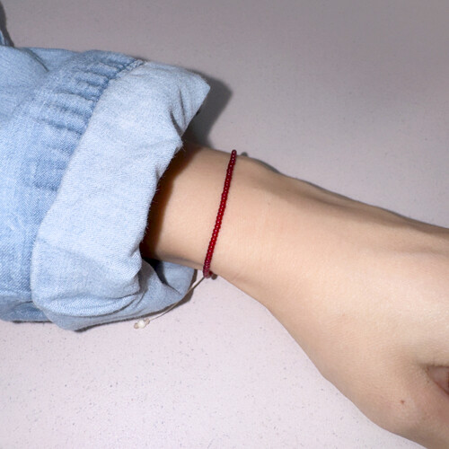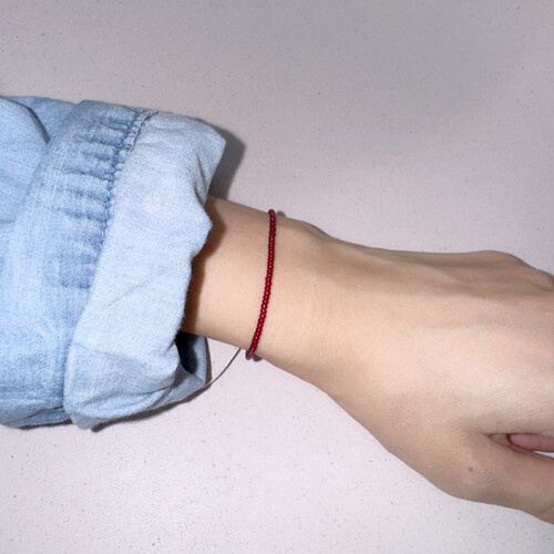 2mm의 작은 레드 비즈들이 얇은 실팔찌 같은 실루엣을 줍니다.