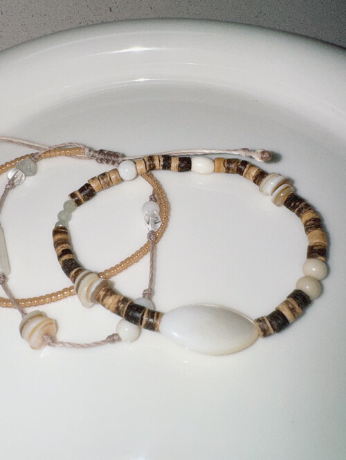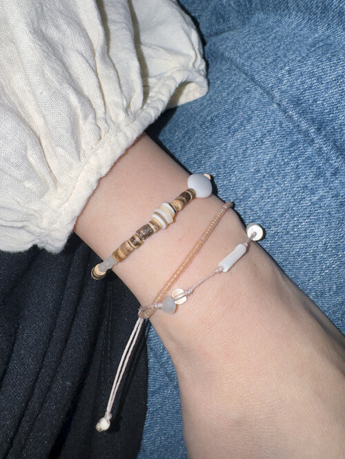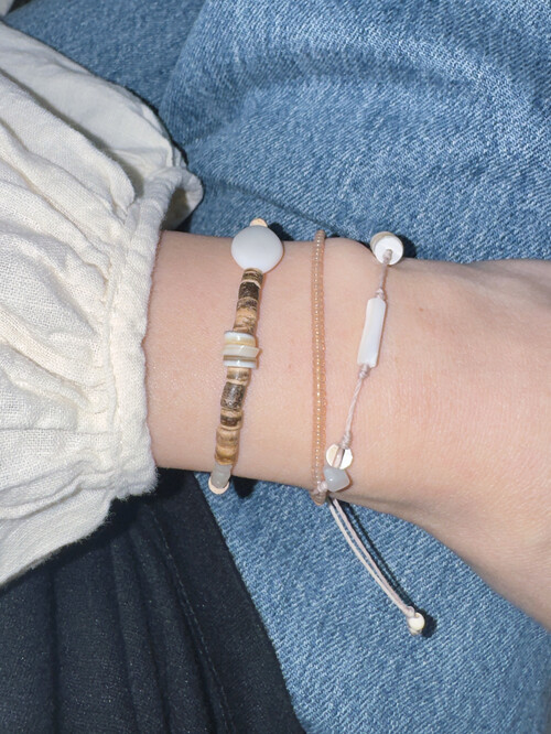 크고 작은 자개들과 원석, 그리고 우드의 색감이 어우러진 팔찌예요.