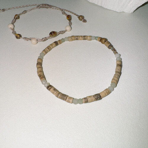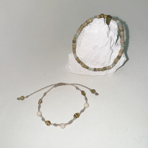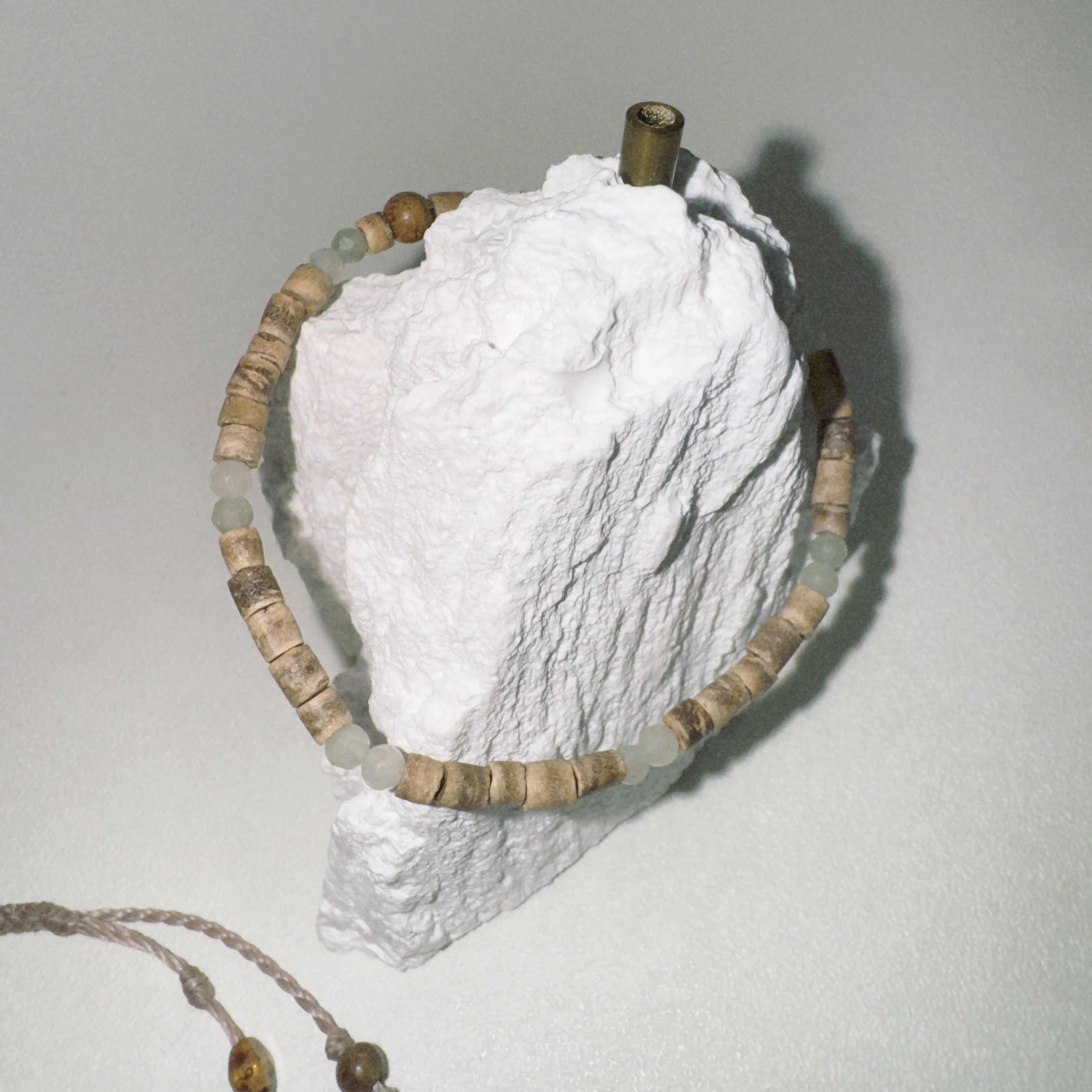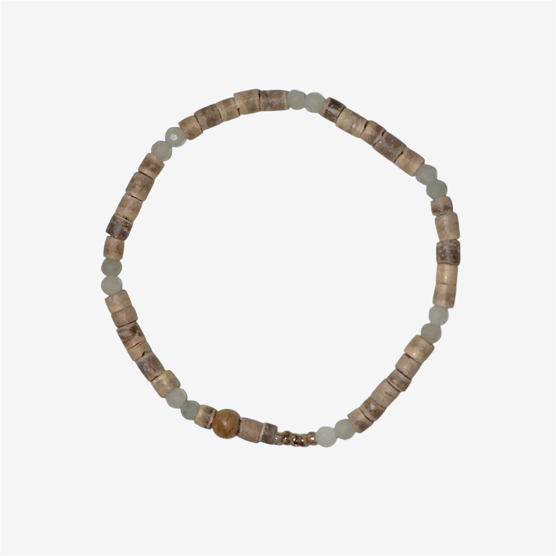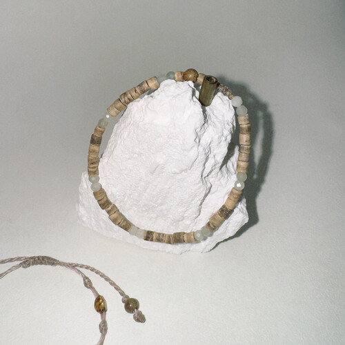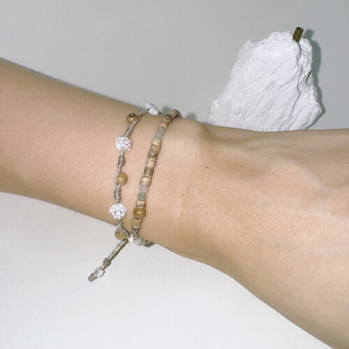 뮤트톤 그린 원석이 매력적인 오무무의 우드 팔찌입니다.